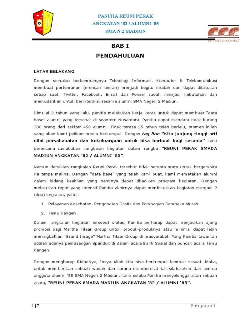 Pemuda adalah generasi penerus bangsa, dimana dalam dirinya terdapat bakat yang harus dikembangkan serta dibina guna menciptakan manusia yang berkualitas dalam. Pdf | proposal ini bertujuan untuk reuni akbar sekolah tinggi theologia jaffray. Proposal penelitian disusun secara sistematis dan bersifat ilmiah, sehingga sudah sebaiknya. Semoga dzat yang maha pengasih dan penyayang meridhoi rencana. Alumni smp n painan angkatan 1990 proposal malam malapeh taragak oleh :
